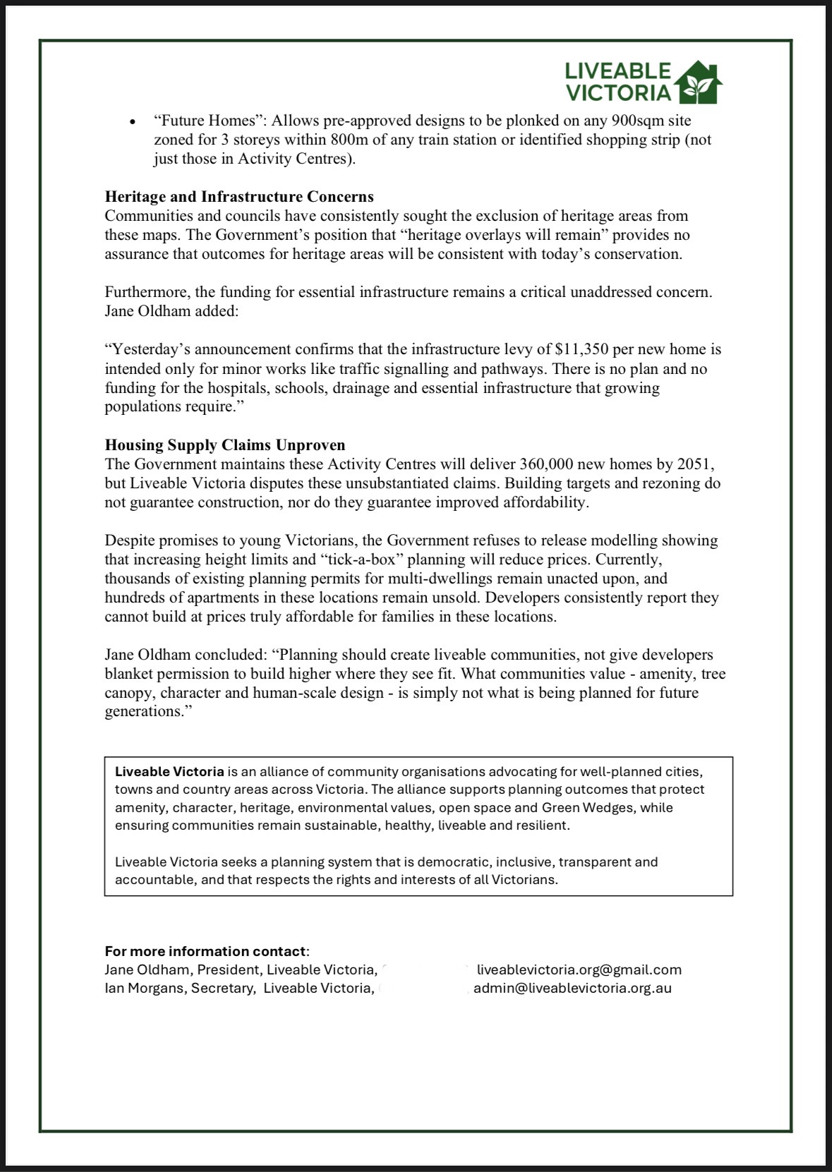 “Planning should create liveable communities, not give developers blanket permission to build higher where they see fit. The Government says it is listening. Yet what communities consistently say they value – amenity, tree canopy, green streetscapes, character, thoughtful conservation of heritage, biodiversity and human-scale design - is not what is planned for future generations.” Oldham continued.
